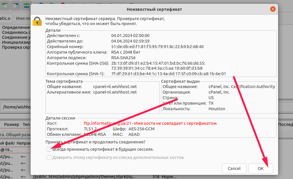 Далее принимаем сертификат (данные при передаче шифруются) и входим в каталог