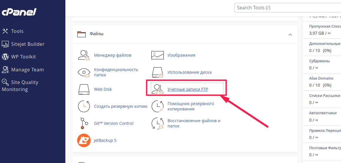 Но бывает что есть необходимость создать еще аккаунт или аккаунты ftp. Для этого в cpanel есть раздел "Учетные записи FTP":