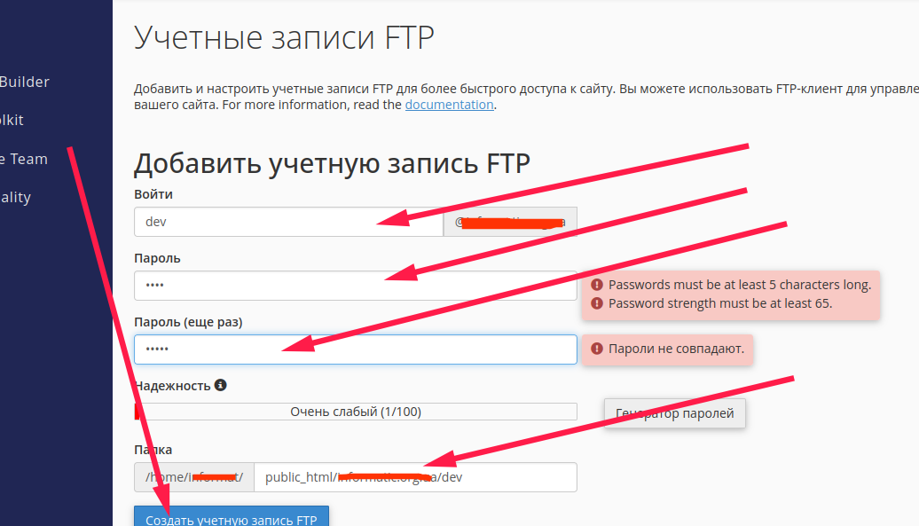 Имя пользователя, к примеру dev, задаем ему пароль или генерируем, далее нужно указать каталог куда будет иметь доступ этот пользователь ftp. Если нужно к всем сайтам то public_html указываем.