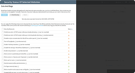 Et enkelt klik på en knap scanner og hærder dine WordPress-websteder mod dine valgte sikkerhedsrisici. Du kan også adgangskodebeskytte bestemte websteder eller sider.